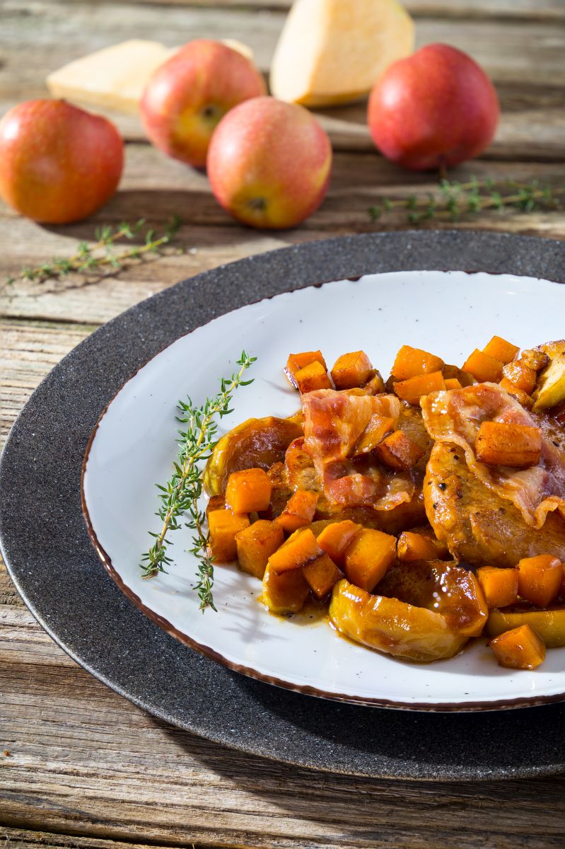Za 2 osebi potrebujemo: 2 svinjska kotleta brez kosti (vsak po 200 g), 100 g dimljene slanine, 300 g kolerabe, 2 manjši jabolki, 5 g masla, 1 žlico olja, 330 ml jabolčnega vina (cidre), sol, sveže mleti beli poper, ¼ žličke mlete kumine, ½ žličke suhega timijana