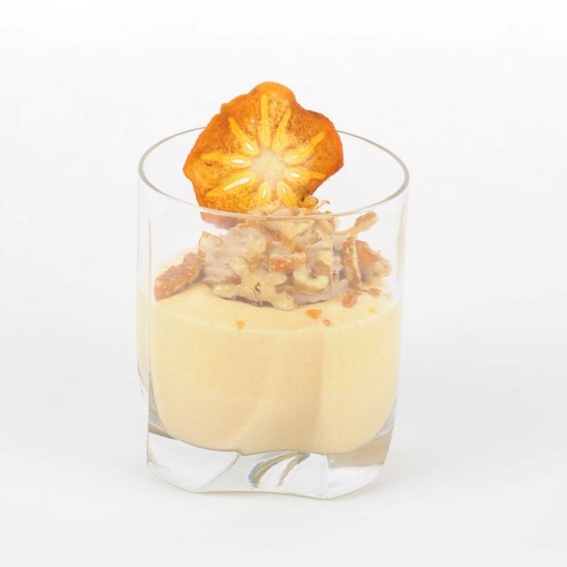 Na kakijevo kremo v vsakem kozarcu nabrizgamo kupček kostanjevega pireja, potresemo s karameliziranimi orehi, poljubno okrasimo in postrežemo.