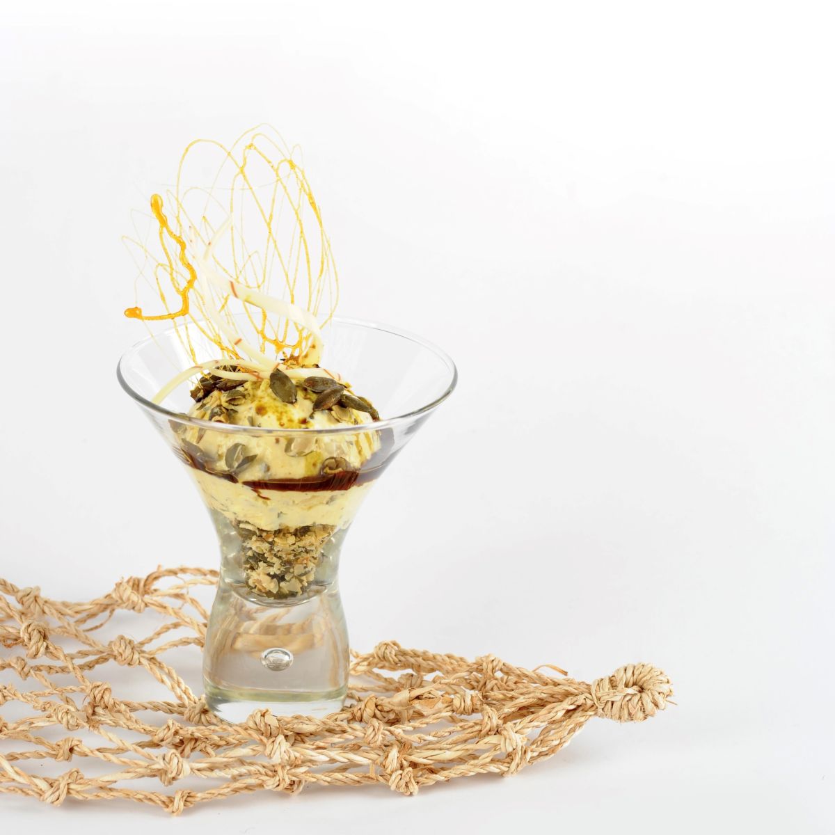 Ko je krema iz bele čokolade ohlajena, jo vzamemo iz hladilnika, z žlico za sladoled oblikujemo krogle in jih damo v izbrane kozarce. Pokapamo z bučnim oljem, potresemo s preostalimi bučnimi semeni in postrežemo.